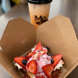 Hadn't been to this Mo Cha tea house location in awhile, and I was happy to say it made me want to visit again soon. Finding parking can be a little tricky because the area has gotten busy (if you park in lot beside it, you will need to use QR code to pay). I recall honey toast being good, so we wanted to try the waffle this time and it was delicious! Texture was spot on - light, airy, crispy on outside to hold up to the ice cream, whip, strawberry sauce on top. Loved having strawberries and blueberries in the mix to keep things fresh. That combo of warm waffle plus cold sweet toppings is a winner!